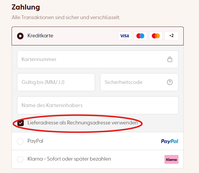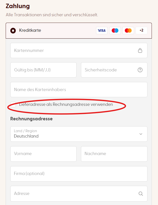 Wenn du möchtest, dass die Rechnungsadresse mit der Lieferadresse übereinstimmt, aktiviere beim Abschluss der Bestellung das entsprechende Kästchen unten.