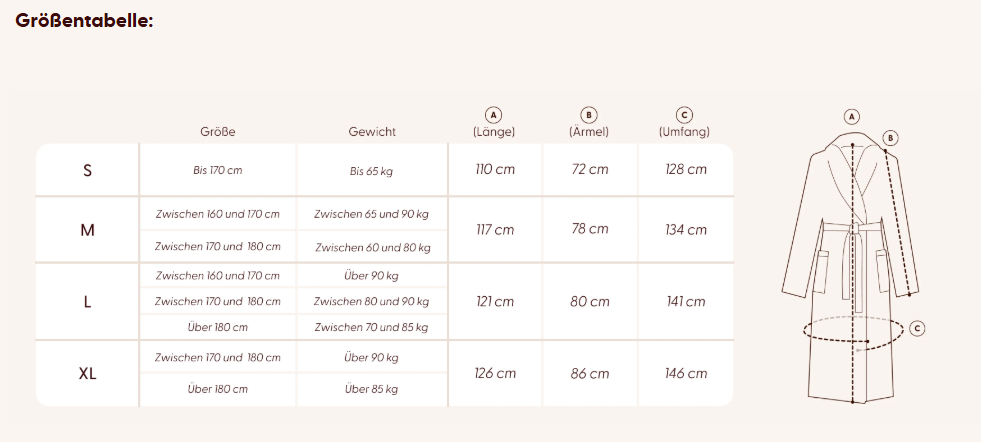 Denke daran, dass unsere Bademäntel großzügig und gemütlich geschnitten sind, um dir maximalen Komfort zu bieten.